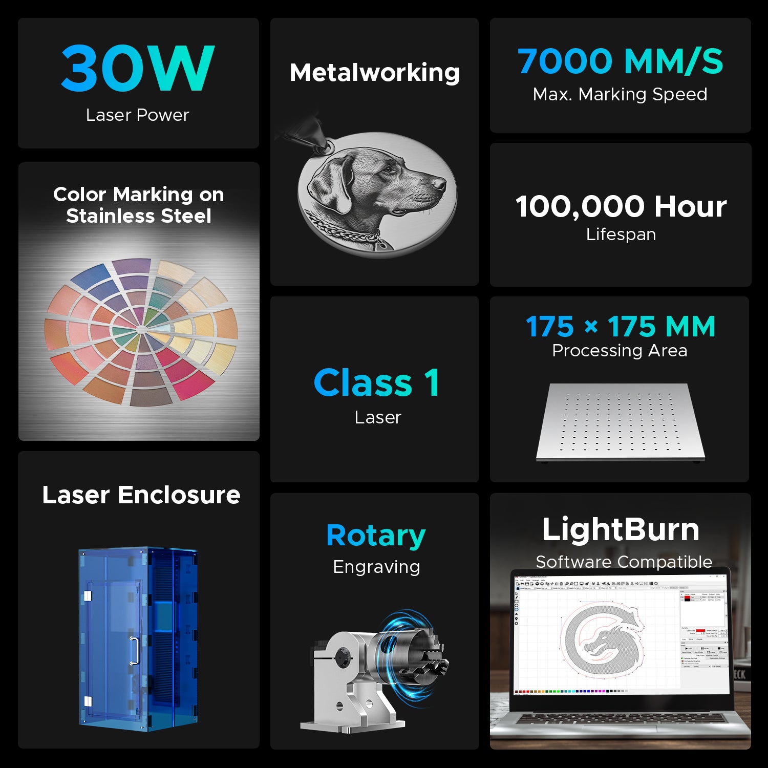 30W MOPA JPT Laser Cutting Machine for Colored Metal Engraving & Metal Cutting with 175mm×175mm Working Area | M-30