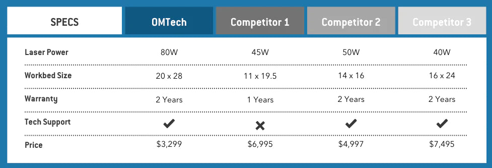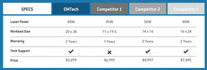 Each laser engraver brand offers specific features that may resonate with customers differently. But most people want the highest-rated laser with the widest capability for the lowest price. That’s why so many people in the laser engraving community are choosing OMTech. Most laser machines will deliver your engraving job, but only OMTech offers more laser, for less.