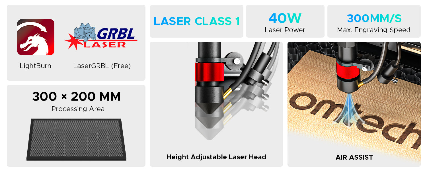 The laser head of our 40W CO₂ laser cutter and engraver offers a 30 mm height adjustment range for materials of varying thickness. This ensures optimal focus, engraving precision, and reliable performance for every project.