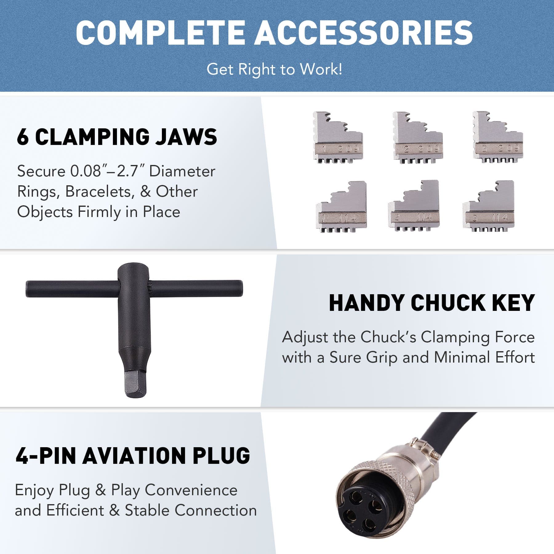 • ADJUSTABLE JAWS: Our rotary laser marker and engraver attachment has 6 clamping jaws and a chuck key included to securely hold cylinders 0.08-2.5 inches (2-63 mm) in external diameter or 1-2.7 inches (25-70 mm) in inner diameter