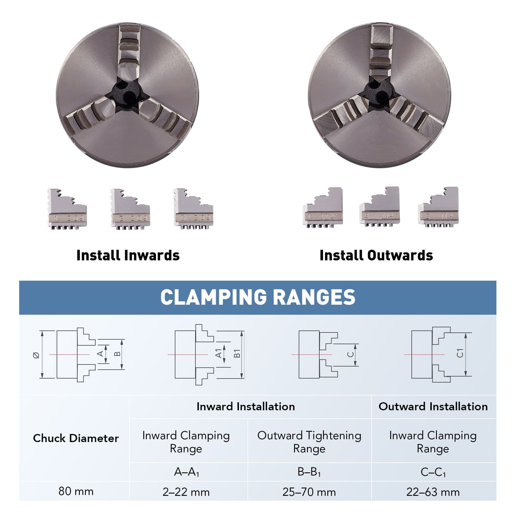 • Inward Clamping Range: 0.08-2.5 in. (2-63 mm)