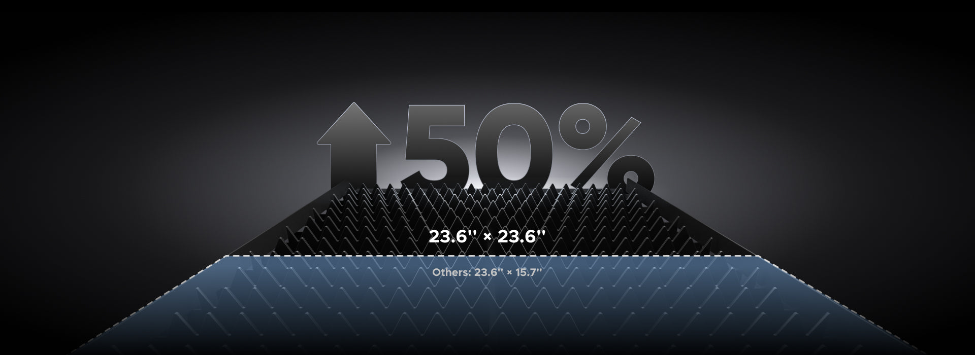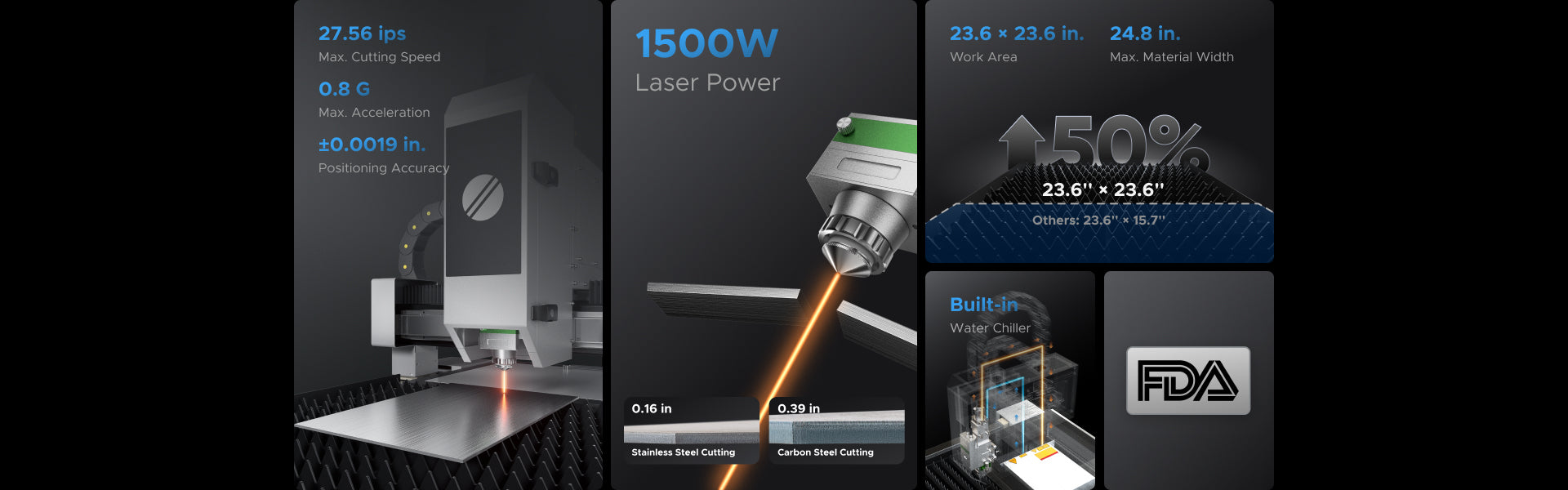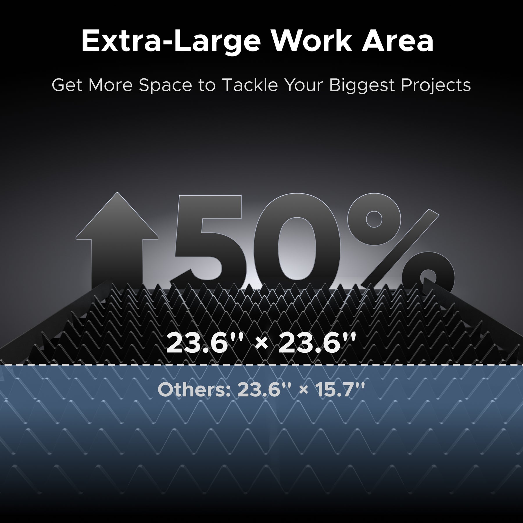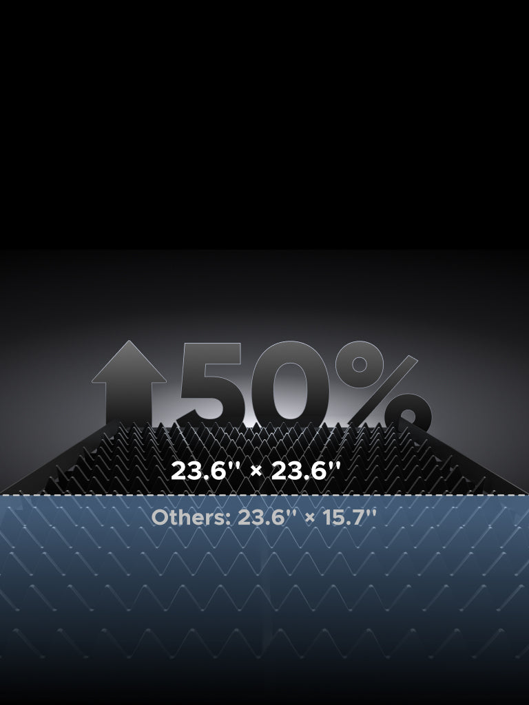 The 23.6 × 23.6 in. work area, capable of handling materials up to 24.8 in. wide,
