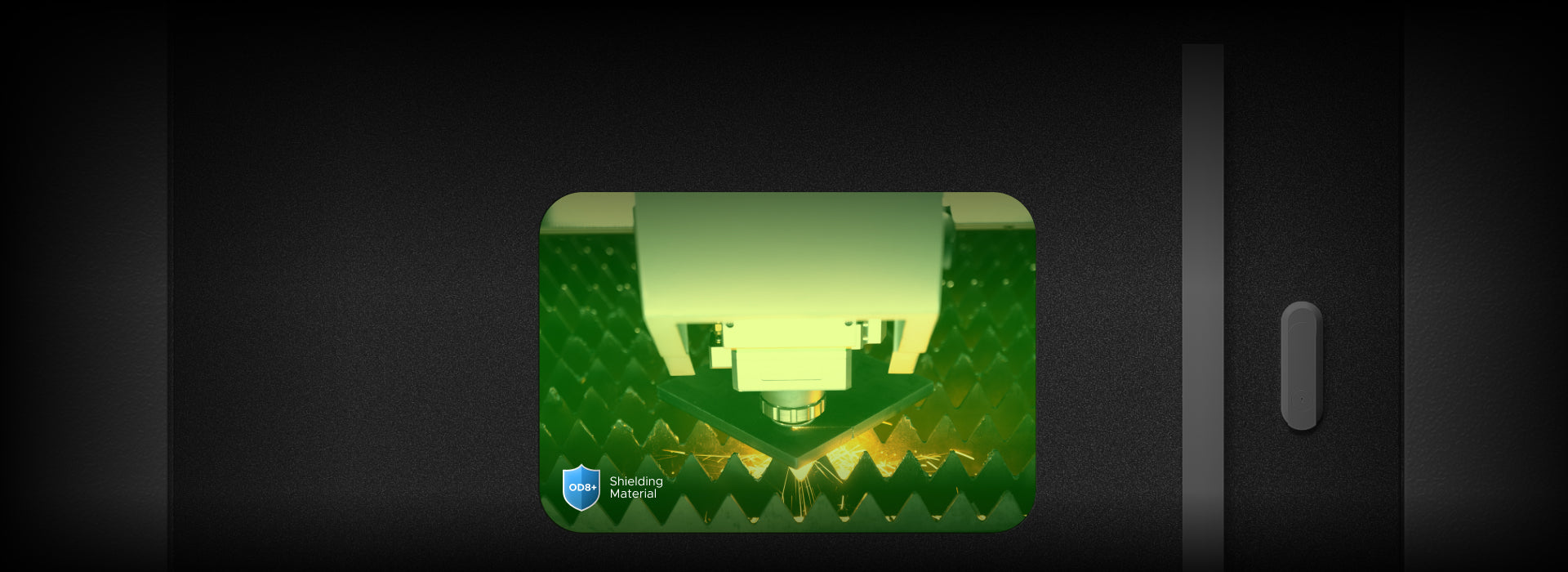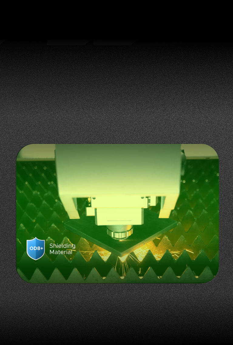 The machine features a fully-enclosed design with an OD8+ safety window for clear observation while preventing laser leakage.