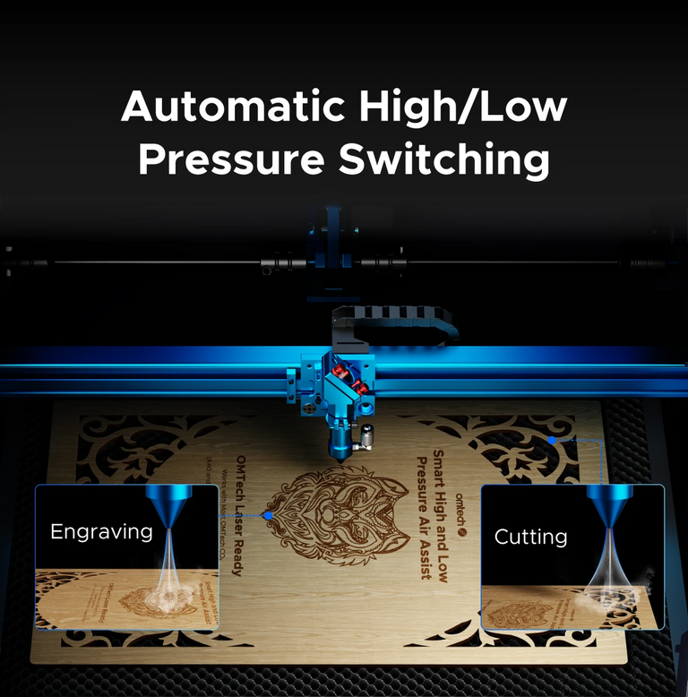 - Automatic Pressure Switching: Our smart air assist delivers a steady 80L/min airflow to eliminate fumes. It automatically switches between high-pressure cutting and low-pressure engraving modes, ensuring perfect results on everything from veneers to wood.