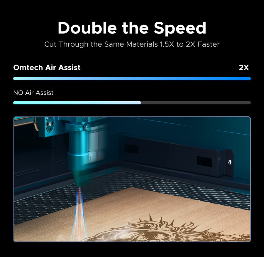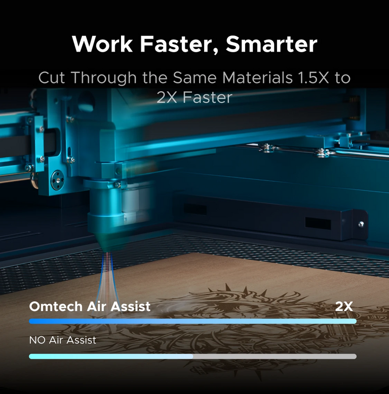 - 2X Faster Processing: This adjustable air pressure module boosts cutting speeds by 1.5-2X on identical materials. Imagine finishing detailed acrylic signage in half the time and keeping your workflow fast, fluid, and flawlessly precise.